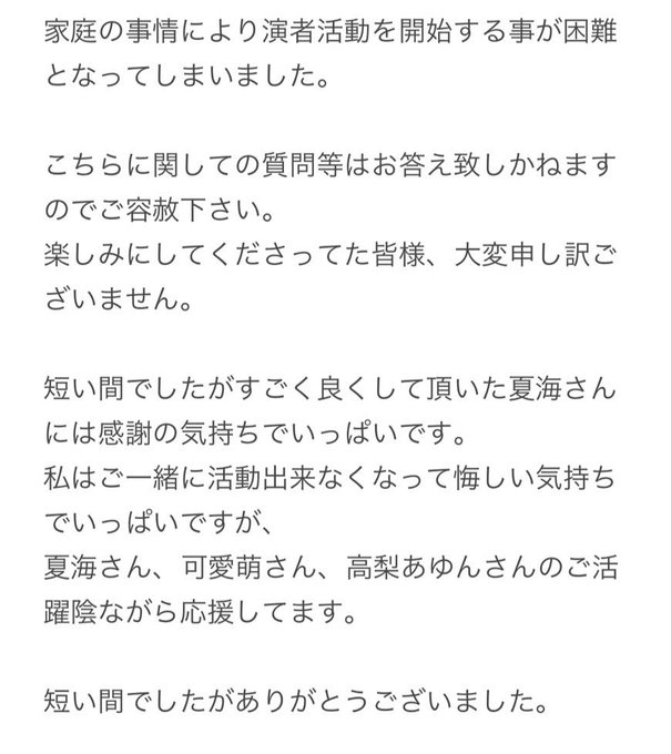 え、11月17日に演者デビュー予定やったのにデビュー前に引退報告ってどゆこと